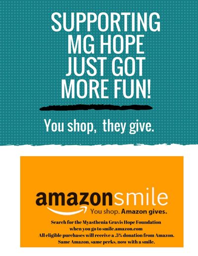 Visit smile.amazon.com and search for the Myasthenia Gravis Hope Foundation and enjoy all the same products and perks of Amazon while Amazon donates back .5% of eligible products to MG Hope.